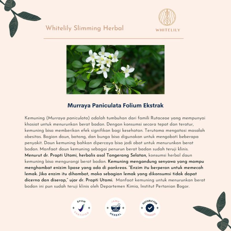Murraya paniculata folium ekstrak. Sekilas Tentang Murraya Paniculata Kemuning Pada. Herbalipid merupakan Kapsul pelangsing bersertifikat BPOM Ha lal terbaik yang sudah teruji 5x lebih ampuh dari merk pelangsing lain. Regular exercise and a low fat and low calorie diet is needed while taking this.