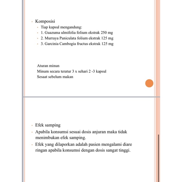 Kandungan Slimming Capsule. Membantu membakar lemak dan meningkatkan metabolisme tubuh. Ekstrak guazuma ulmifolia folium ekstrak zingiberis purpurei rhizoma ekstrak murraya paniculata folium ekstrak elephantopus saber folium.
